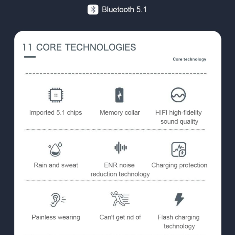 Bluetooth 5.1 chip brings high speed and stable transmission, which has strong ability of anti-interference. You will feel comfortable to wear the earphone with ergonomic design.