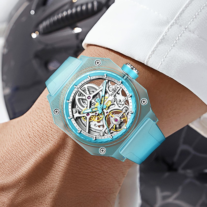Fully Transparent Crystal Glass Case with Double-sided hollow dial, panoramic back transparent, for you to capture the mechanical scenery. Trendy Color Matching, Bright colors interact with transparent elements. It is like a movement floating between the wrists, presenting a cool sci-fi visual sens. Unique and highly recognizable. Simple three-pin design, eye-catching and easy to read. High-definition luminous coating, no fear of the dark.