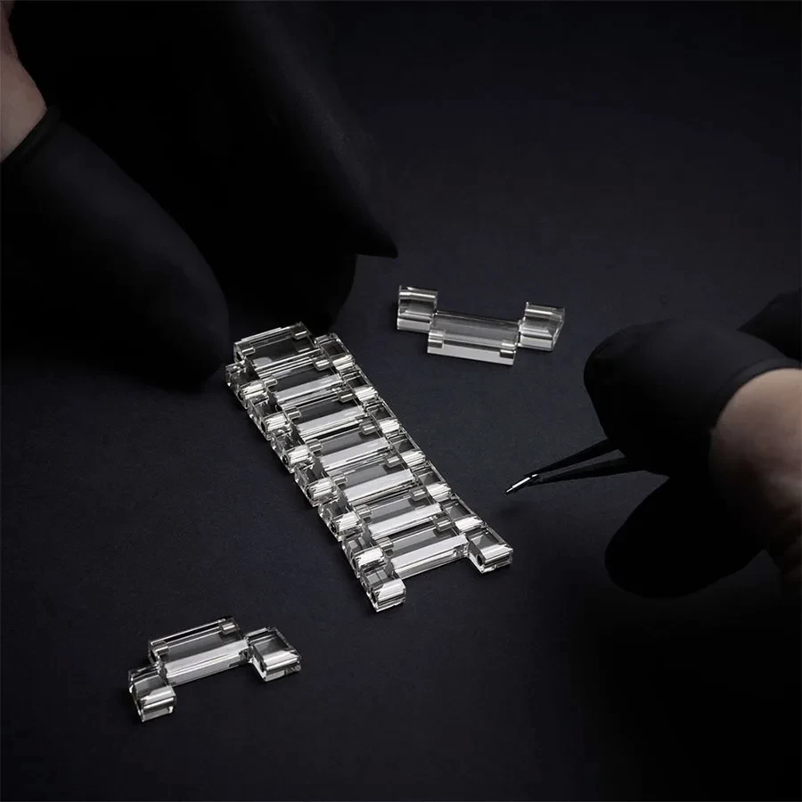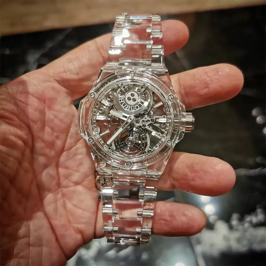 Phiên bản Đồng Hồ Nam Hublot Integral Tourbillon Full Sapphire Watch 455.JX.0120.JX xứng đáng là món phụ kiện dành cho quý ông trong, thách thức mọi ánh nhìn. Hãng đã tạo ra độ trong suốt cao với dây đeo sapphire, điều này cũng khiến nó trở thành một kỳ tích đầy thách thức để đạt được. Ricardo Guadalupe, Giám đốc điều hành của Hublot từng đánh giá về chiếc đồng hồ độc đáo này: "Đối với một sáng tạo đặc biệt như vậy, chúng tôi đã chọn bộ máy Automatic Tourbillon mới với các cầu nối bằng sapphire của nó, độ trong suốt của nó tạo nên một cảnh tượng tuyệt đẹp".