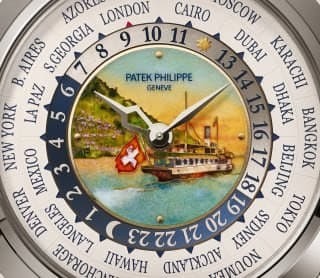 Patek Philippe equipped the World Time Minute Repeater Reference 5531 with white gold. The center of the dial is adorned with a new Grand Feu cloisonné enamel pattern depicting one of the famous steamboats of the Belle Époque fleet still navigating Lake Geneva to this day. The result is a miniature masterpiece of Rare Handcrafts entirely handcrafted.